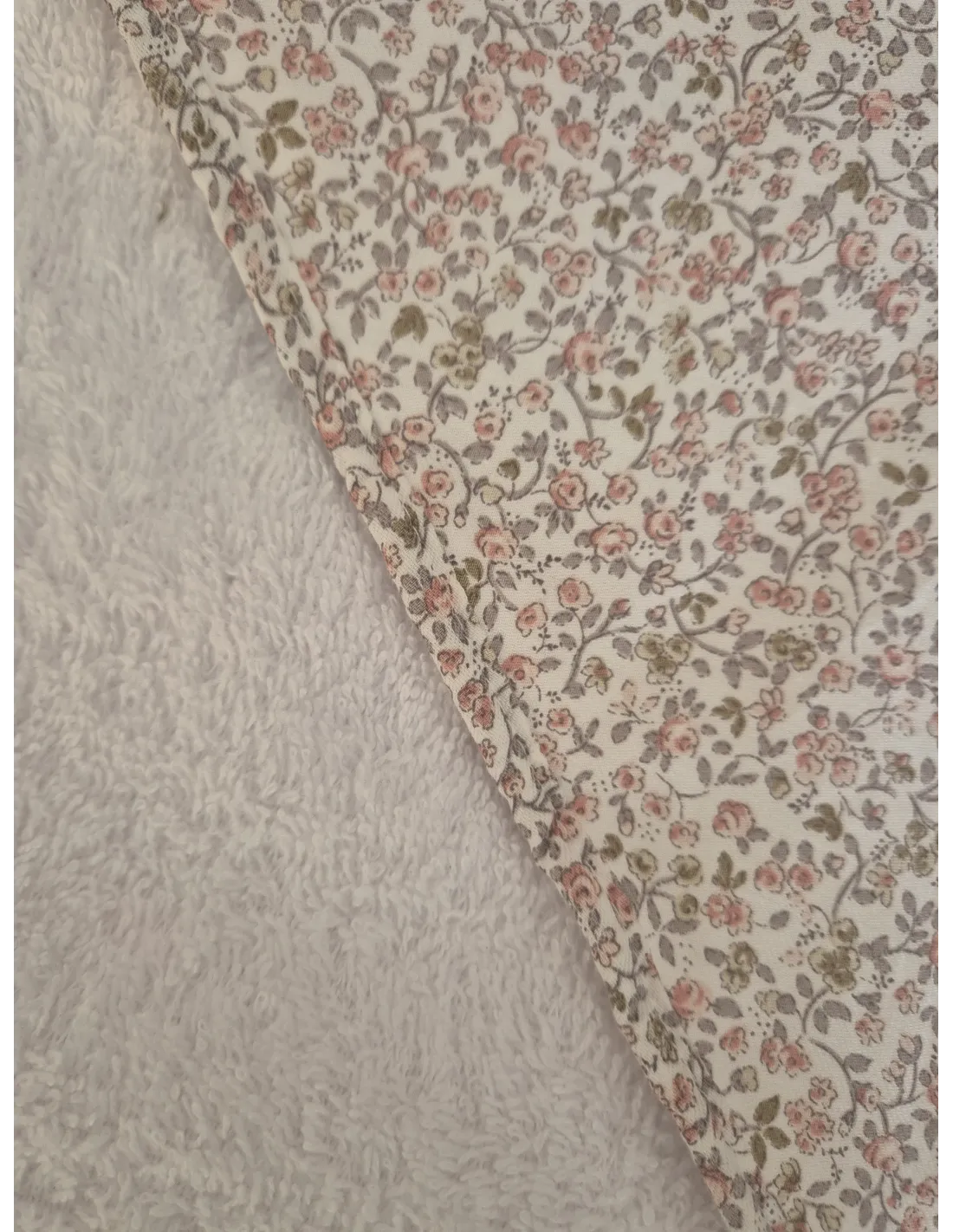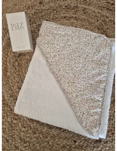 Capa de baño de rizo blanco , capucha con estampado liberty, y ribeteada alrededor con misma estampación.